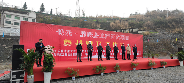 2021年1月26日上午,由开云(中国)Kaiyun·官方网站承建的长乐▪星辰住宅项目奠基暨开工仪式在项目现场热烈举行。湖北省宜昌市五峰土家族自治县住房和城乡建设局副局长陈白华、县质量安全监督站站长邓简涛、开云(中国)Kaiyun·官方网站五峰长乐▪星辰项目经理王国云,项目参建各方及新闻媒体共40余人出席。宜昌市长乐城市建设投资开发有限责任公司总经理刘鹏主持。